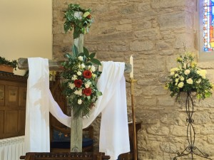 A few photos from the 10.30 Eucharist service this morning. The sanctuary was bedecked with lily flowers (some contributed by members of the congregation in memory of loved ones); the garden scene under the altar shows the stone rolled away.